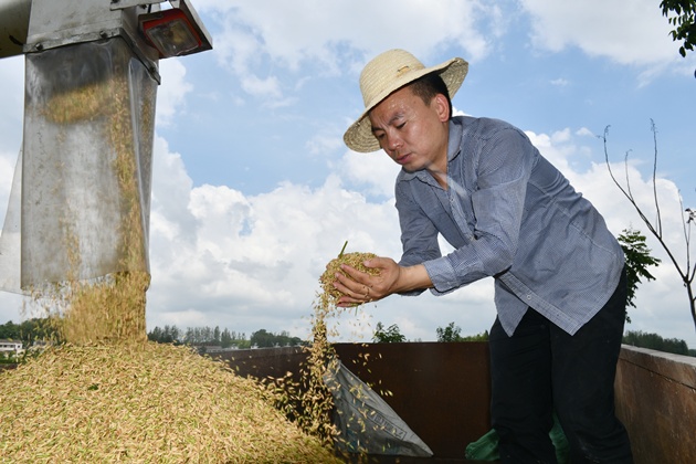 光山縣鑫磊農業(yè)專(zhuān)業(yè)合作社負責人黃鑫站在運輸車(chē)上手捧著(zhù)收獲上來(lái)的稻谷,臉上露出了幸福的微笑。他興奮地說(shuō),今年種植了400多畝再生稻,在我院專(zhuān)家的技術(shù)指導下,克服了早春低溫、夏初干旱和后期持續降雨帶來(lái)的不利影響,頭季稻長(cháng)勢良好,從最近兩天入倉稱(chēng)重情況看,今年畝產(chǎn)能達到1200斤以上,頭季稻新谷每斤較往年高出近0.2元,目前來(lái)看,經(jīng)濟效益也很不錯。接下來(lái),要按照我院提供的技術(shù)方案,加強二茬稻田間管理,再奪再生季豐產(chǎn)豐收。鑫磊農業(yè)專(zhuān)業(yè)合作社種植再生稻已有五年光景,他深刻地感受到種植再生稻不僅省工省力、節本增效,而且能趨利避害,抗災能力強,他計劃明年進(jìn)一步擴大種植面積,取得更大的收益。