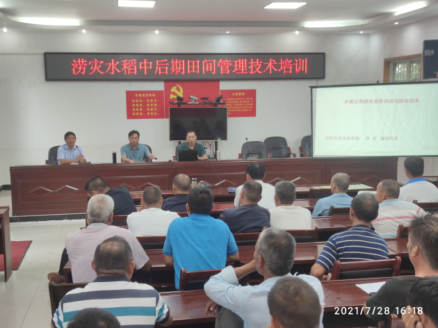 7月28日上午,時(shí)而天色昏暗、大雨滂沱,時(shí)而比較溫和,雨勢平緩。在息縣曹黃林鎮工作人員張杰的陪同下,服務(wù)團一行冒雨來(lái)到位于謝老寨村的息縣金谷糧食制品有限公司,由公司負責人謝偉帶路前往再生稻、優(yōu)質(zhì)稻及瓜蔞生產(chǎn)基地進(jìn)行調研。段斌研究員穿上膠鞋,踏著(zhù)泥濘,每到一處田塊,他都仔細查看水稻生長(cháng)發(fā)育進(jìn)程、群體發(fā)展態(tài)勢、病蟲(chóng)危害等情況,詳細詢(xún)問(wèn)品種選擇、種植方式、田間排澇及前期管理,然后提出切實(shí)可行的技術(shù)措施:密切關(guān)注天氣變化,低洼田塊及時(shí)排水降濕,搶晴防治稻縱卷葉螟,根據品種及長(cháng)勢酌情追施尿素,適時(shí)防治稻曲病等。下午,在息縣中綠生態(tài)農業(yè)有限公司總經(jīng)理李林的召集和安排下,選擇在陳棚鄉政府會(huì )議室召開(kāi)澇災水稻中后期田間管理技術(shù)培訓會(huì ),息縣農科所朱樹(shù)貴副研究員主持培訓會(huì )。段斌研究員、扶定副研究員分別以《澇災水稻田間肥水管理》、《澇災水稻病蟲(chóng)害防治》為題進(jìn)行技術(shù)培訓,講解通俗易懂、深入淺出,同時(shí)發(fā)放技術(shù)資料80余份,并對參會(huì )人員提出的問(wèn)題一一解答,全鄉種田大戶(hù)、家庭農場(chǎng)等新型農業(yè)經(jīng)營(yíng)主體技術(shù)人員65人參加。參會(huì )人員紛紛表示,此次培訓會(huì )針對性、時(shí)效性強,恰逢其時(shí),為應對不利氣候減輕對水稻的影響提供了及時(shí)有效的技術(shù)指導。